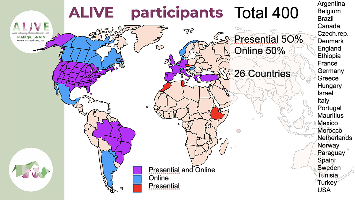 We are pleased to communicate that the ALIVE Congress (Animal Leishmaniosis International Veterinary Event), organized by the LeishVet group, was successfully held in Málaga between March 31st and April 2nd, 2022. Its international character has allowed a total of 197 (in person) and 202 (online) researchers, practitioners and dermatologists from 26 countries to come together for the event.